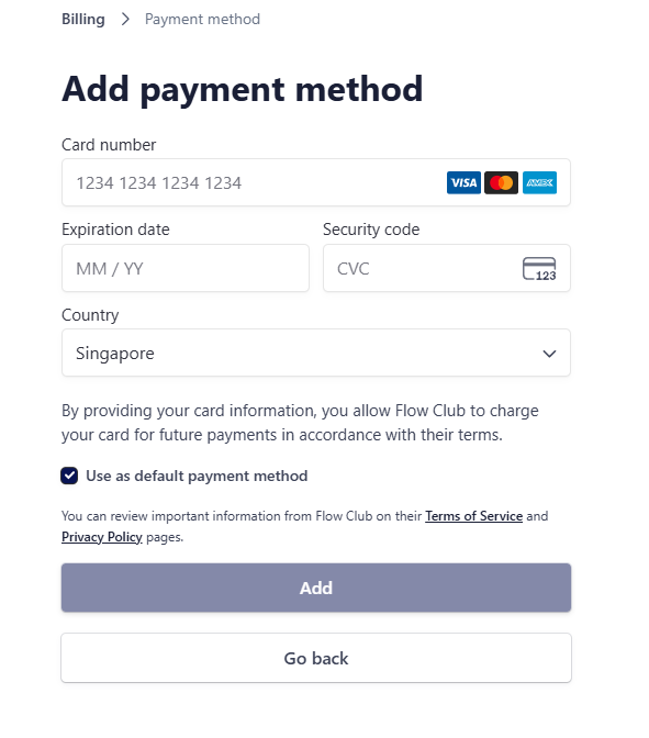 To change the card on file or payment method, go to your Membership settings here: https://in.flow.club/settings/billing/